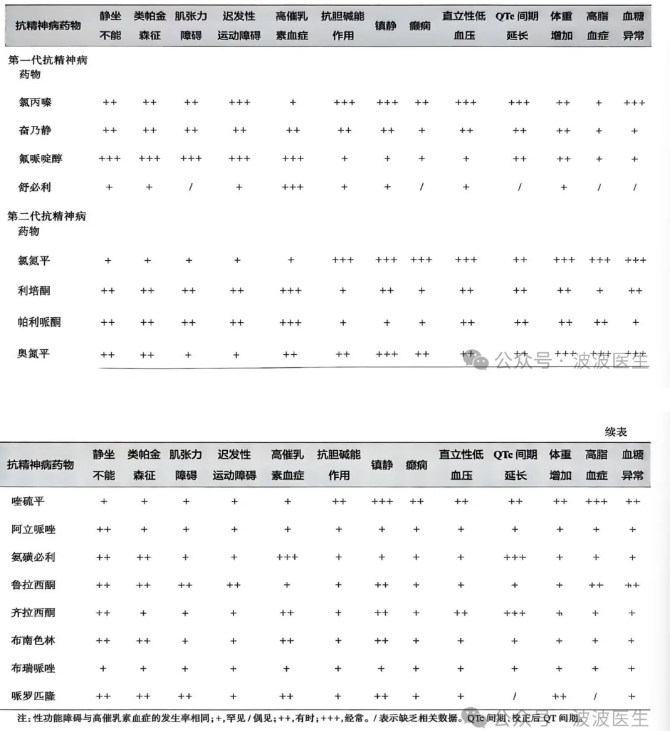 1、风险药物:氨磺必利>利培酮(++)>帕利哌酮(++)>氟哌啶醇(+++),阿立哌唑、氯氮平风险最低。