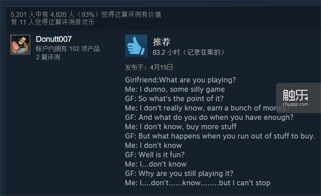 关于“数值—收集瘾”的一个极端例子《AdVenture Capitalist》,在此笔者不评论,各位看官看看Steam上的评论笑一笑就好了。iOS平台也有免费版本,有愿意以身试毒的,我可概不负责呐。