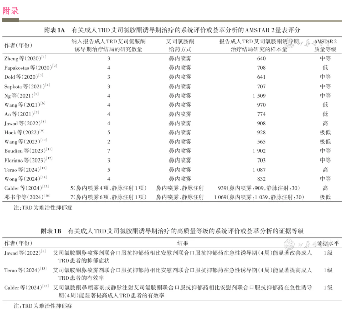 荟萃分析显示,对于成人TRD,与安慰剂相比,鼻腔给药艾司氯胺酮鼻喷雾剂联合口服抗抑郁药经过4周的诱导期治疗能显着改善TRD患者的抑郁症状(证据等级:A级),提高治疗有效率和缓解率(证据等级:A级) [ 22 , 23 , 24 ] 。详情见 附表1A 、 1B 。在诱导期使用艾司氯胺酮鼻喷雾剂,18~64岁患者大多采用每次56 mg 或 84 mg的灵活剂量(56 mg起始,后续可根据疗效和耐受情况加量至84 mg/次或维持56 mg/次) [ 7 , 25 , 26 ] ,年龄≥65岁患者采用每次28 mg、56 mg或84 mg的灵活剂量 [ 27 ] ,均为每周给药2次,共进行8次为期4周的治疗。1项主要纳入成人TRD患者的荟萃分析显示,艾司氯胺酮鼻喷雾剂剂量超过28 mg/次时其抗抑郁疗效增加,最佳治疗剂量为56~84 mg/次 [ 28 ] (证据等级:A级)。但在东亚人群(中国和日本)进行的双盲RCT均未发现鼻腔给药艾司氯胺酮鼻喷雾剂(中国人群采用每次56 mg或84 mg剂量,日本人群采用每次28 mg、56 mg或84 mg剂量,均为每周给药2次,共进行8次为期4周的治疗)联合口服抗抑郁药治疗TRD的显着疗效优势 [ 25 , 29 ] 。东亚人群与其他地区人群在艾司氯胺酮鼻喷雾剂的临床研究结果上的差异,可能与种族间药物代谢及基因多态性等方面的差异相关。希望未来有更大样本量中国人群的研究证据来确定艾司氯胺酮鼻喷雾剂治疗TRD的疗效。另有一项开放标签、评估者单盲RCT研究显示,与喹硫平缓释剂联合口服SSRI或SNRI类抗抑郁药相比,鼻腔给药艾司氯胺酮鼻喷雾剂联合口服SSRI或SNRI类抗抑郁药在8周时显着提高TRD患者的缓解率 [ 30 ] 。