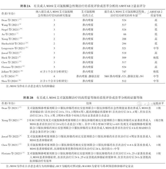 对于成人MDSI,荟萃分析显示,与安慰剂相比,鼻腔给药艾司氯胺酮鼻喷雾剂联合口服抗抑郁药能快速改善MDSI患者的抑郁症状(证据等级:A级),但未能显着改善患者的自杀意念(证据等级:A级) [ 22 , 35 , 36 , 37 , 38 ] 。详情见 附表2A 、 2B 。在伴急性风险的成人MDSI患者中开展的艾司氯胺酮鼻喷雾剂RCT [ 10 , 11 ] 及前期的概念验证研究 [ 39 ] 仅纳入18~64岁的成年人,治疗剂量为84 mg/次(无法耐受者剂量降低至56 mg/次),每周给药2次,共进行8次治疗(证据等级:A级)。需要注意的是,上述荟萃分析纳入的3项RCT [ 10 , 11 , 39 ] 研究人群均为近24 h有自杀企图、目前有自杀意念的急需住院的急诊科或精神科病房患者,符合高急性自杀风险的标准(特征为目前存在自杀意念并有自杀死亡的意图,以及在没有外部帮助或支持的情况下无法独立维持安全)。目前尚无C级及以上证据支持其他给药方式的艾司氯胺酮应用于成人MDSI的治疗。